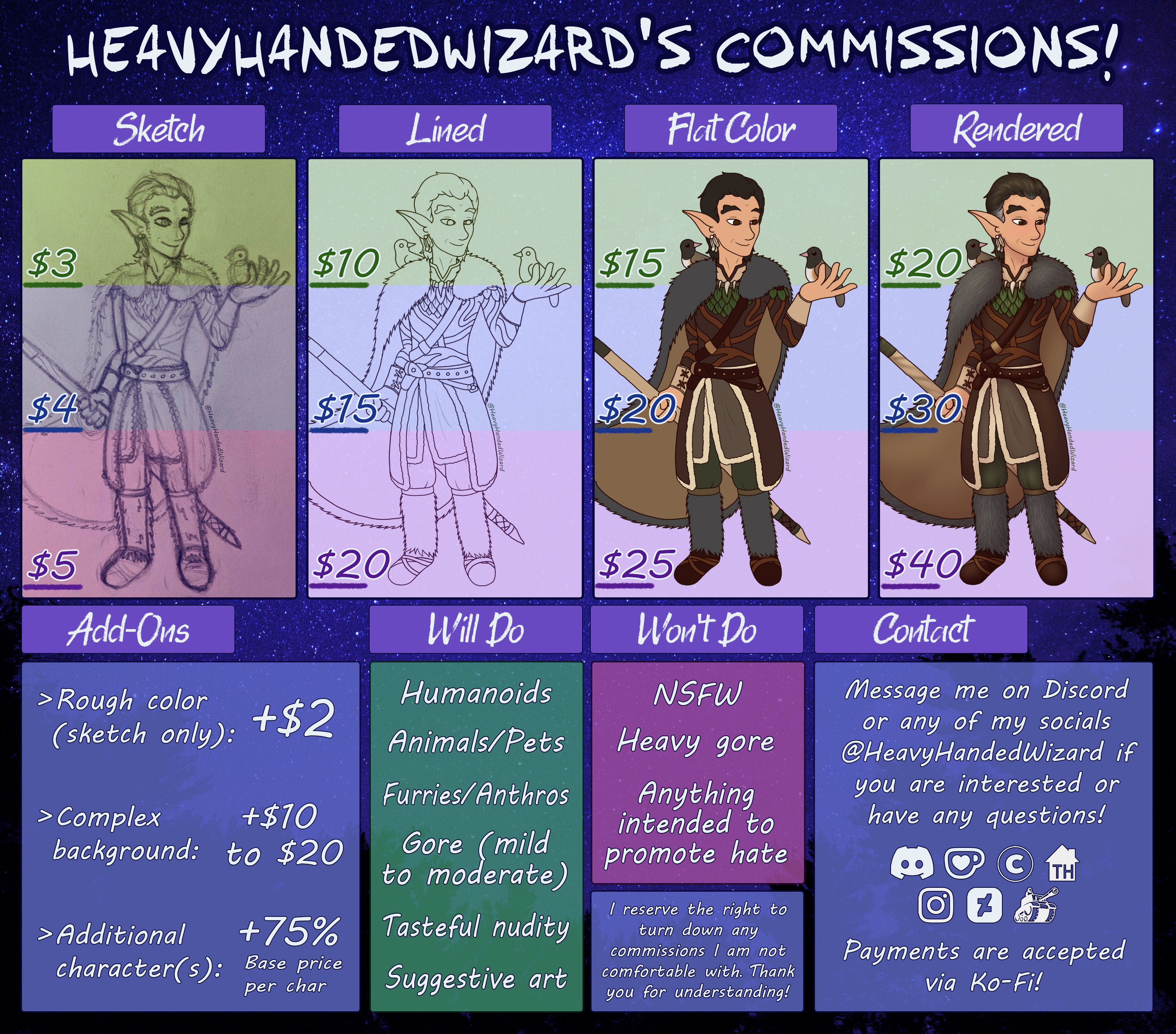 Please contact me if you have any questions or are interested in a commission!! I'm @HeavyHandedWizard on Discord and on all of my socials!